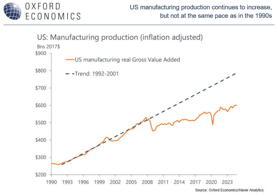 As reshoring remains a policy priority, US manufacturing faces structural challenges despite growing output.
