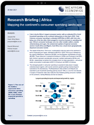 Urbanisation and pockets of increased socio-economic development have resulted in African cities becoming hotspots from a consumer spending perspective. This Research Briefing maps Africa’s consumer spending landscape by showing in which cities the most spending is taking place and exploring where we can expect to see the strongest growth in consumer spending over the next decade.