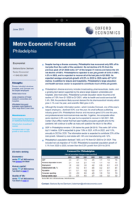 - GDP in Philadelphia remains 1.3% below the peak Q4 2019. This ranks 36th of the top 51 metros. GDP is expected to grow 7.9% in 2021, 4.5% in 2022, and 1.5%, annually in 2023 to 2025.