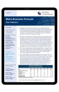 - GDP in San Francisco remains 0.1% below the peak Q4 2019. This ranks 19th of the top 51 metros. However, with its large tech-related base, GDP is expected to grow 9.2% in 2021 and 5.9% in 2022.