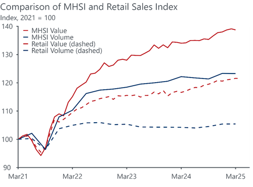 - The MHSI provides detailed spending for specific goods and services, while Retail Trade relies on business-reported surveys categorised by broader industry. Some components are comparable, but there are key differences in definitions and unique categories. At the state level, both series generally trend together but differ in magnitude, reflecting MHSI’s broader coverage of services.