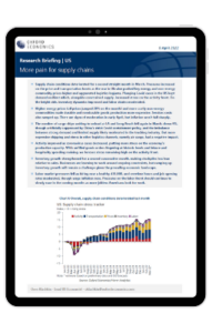 Supply chain conditions deteriorated for a second straight month in March. Pressures increased on the price and transportation fronts as the war in Ukraine pushed key energy and non-energy commodity prices higher and aggravated logistics logjams. Plunging Covid cases in the US kept demand resilient which, alongside constrained supply, increased stress on the activity front. On the bright side, inventory dynamics improved and labor strains moderated.