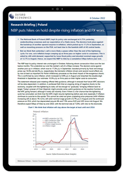 The National Bank of Poland (NBP) kept its policy rate unchanged at 6.75% yesterday, undershooting consensus and our expectation of a 25pbs move. The decision took place against the backdrop of another upward surprise in inflation, which picked up to 17.2% in September, as well as mounting pressure on the PLN, not least due to the hawkish shift of AE central banks.