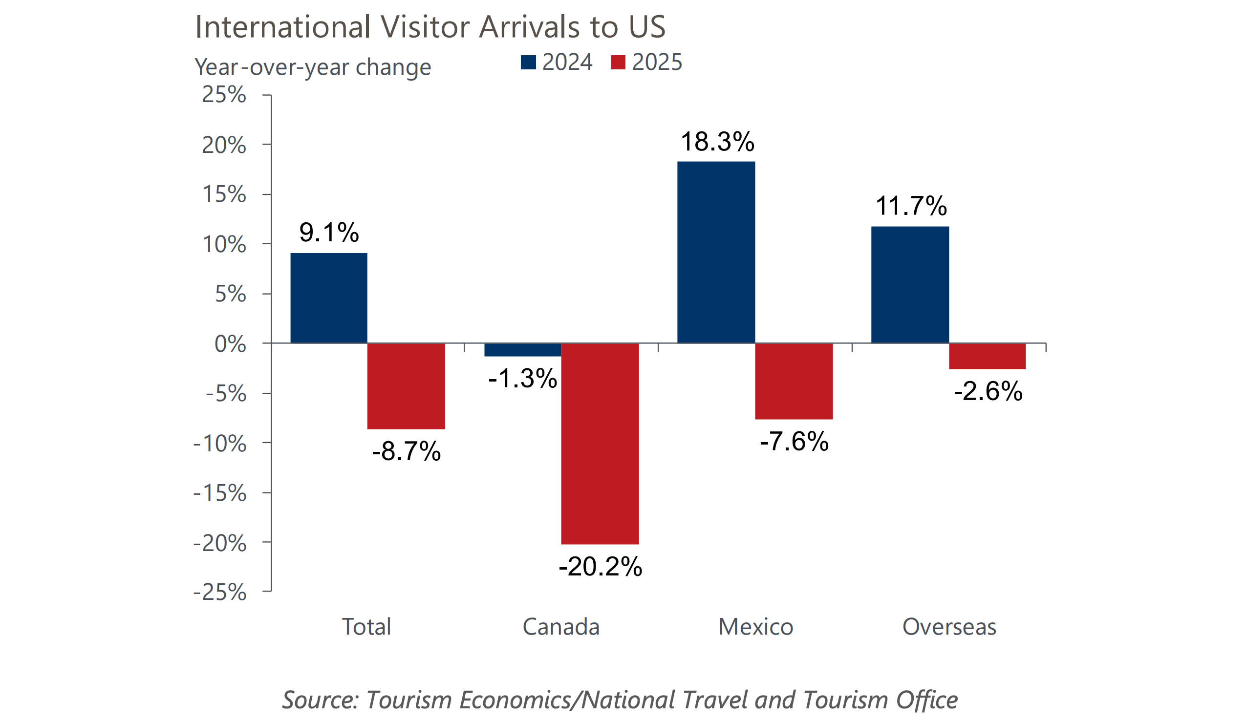 - Sentiment headwinds are negatively impacting US inbound travel. We expect a decline of 8.7% in US international arrivals for the year overall (compared to a 9.4% decline in our March forecast).