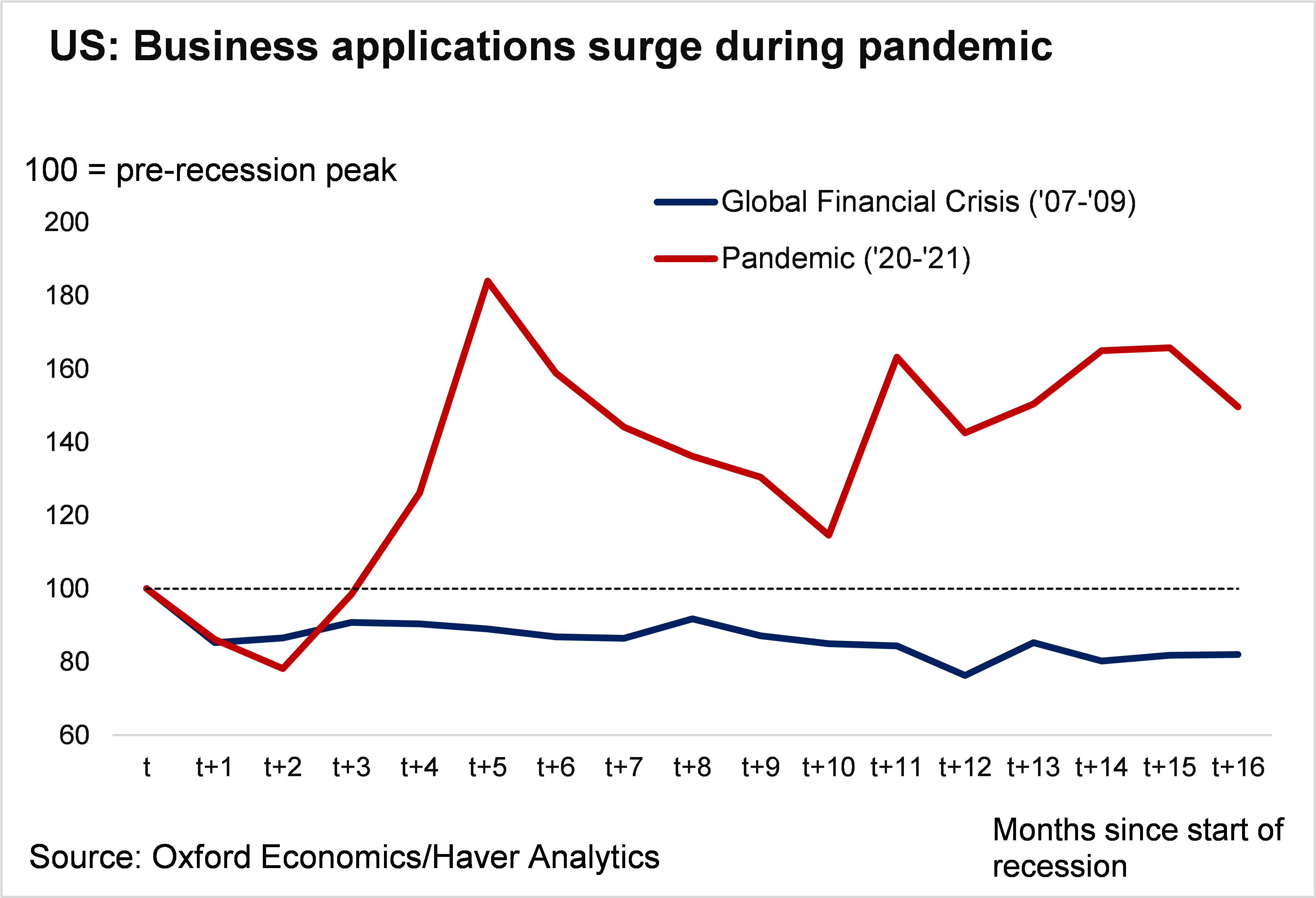 Research from the Federal Reserve found that roughly 130,000 additional businesses in the US closed their doors in the first year of the pandemic compared with a typical year. While recession years are typically not an ideal time to start a business, the months since last spring’s broad lockdowns have seen the filing of more than 2.4 million new business applications, an astonishing feat considering that only 1.8mn applications were filed in the 16 months prior to the pandemic. Many of these are “high-propensity” business applications—new corporations that plan to hire employees and have provided a first wages-paid date.