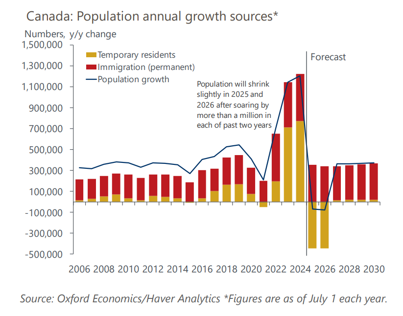The government’s plan to cut immigration and reduce the number of temporary residents will cause Canada’s population to decrease slightly in 2025 and 2026, after soaring by more than 2 million people over the past two years. This unprecedented immigration policy U-turn will significantly dampen economic growth over the next few years.