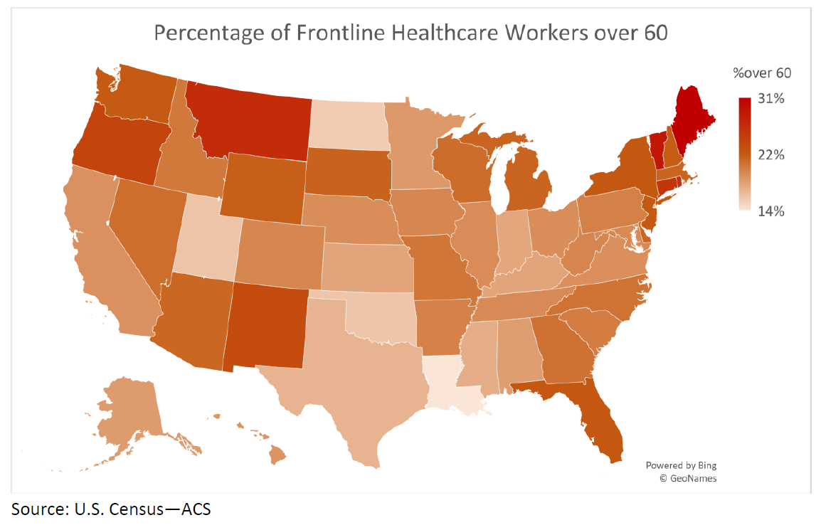 Oxford Economics looked at the demographics of the US healthcare workforce, including frontline occupations (e.g., doctors, nurses, respiratory therapists) facing acute risks of exposure to coronavirus while treating patients in hospitals, nursing homes, clinics, and other facilities. The median percentage of frontline healthcare workers who are older than 60 across the country is 20%, compared to 23% in New York, New Jersey, and Florida. In Maine, nearly one in three frontline workers is over 60; Vermont and Montana also have high percentages of older workers, followed by Connecticut and Oregon.