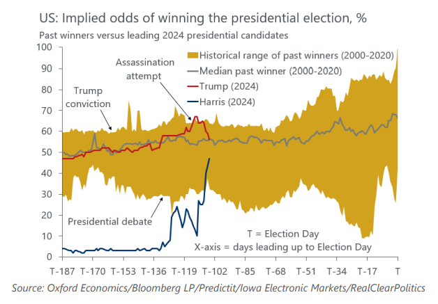 - According to betting markets, former President Donald Trump is still the favorite to win, but the implied odds of him winning have declined by 10ppts, from 65% to 55%, putting them on par with the median eventual winning candidate at this stage of the election cycle. Unlike Biden, who was below the range of past winners, Vice President Kamala Harris’ implied odds are within it.