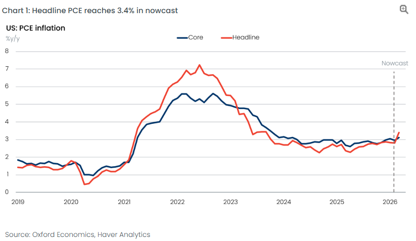 Higher energy prices due to the US/Israel war with Iran will provide the biggest boost to the March PCE index. Our PCE nowcast estimates that year-over-year headline PCE inflation will rise to 3.4%, its highest since September 2023, while core PCE inflation will increase to 3.1%.