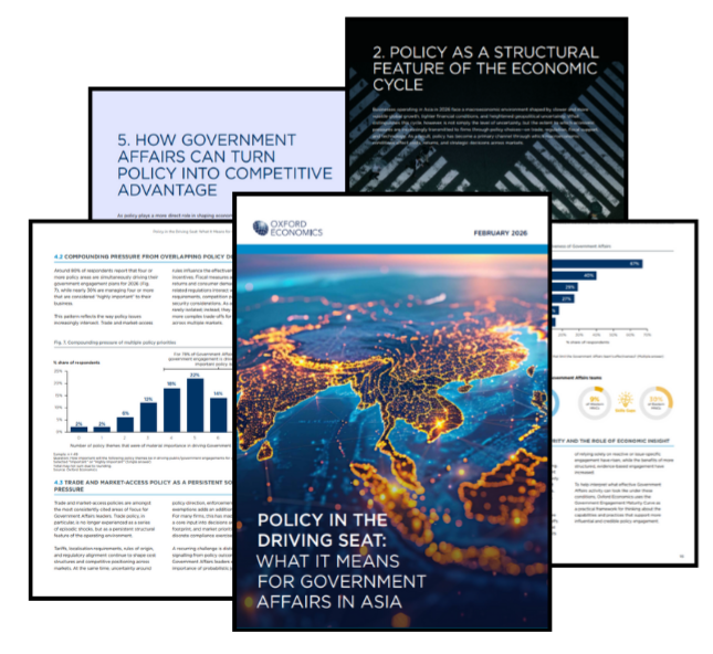 This report draws on new survey evidence from senior Government Affairs leaders across Asia, combined with Oxford Economics’ macroeconomic analysis. It explores how a layered and overlapping policy agenda is reshaping the role of Government Affairs—and why economic insight has become central to effective engagement with policymakers and internal decision-makers alike.
