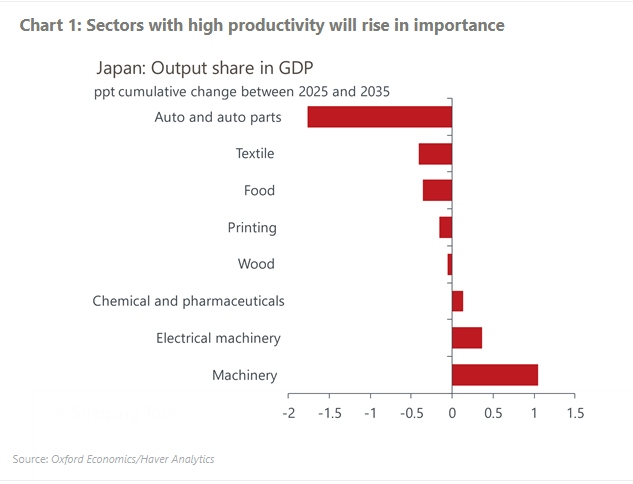 As labour shifts to more productive sectors, economy-wide productivity will also rise, but not without challenges. External factors like tariffs and the EV transition, where Japanese automakers fall behind, will weigh on the auto sector. Moreover, labour market frictions, such as tight regulations and the cost of reskilling, could hamper labour movement across sectors.