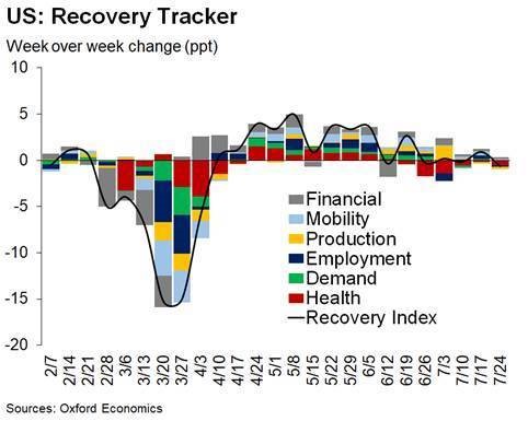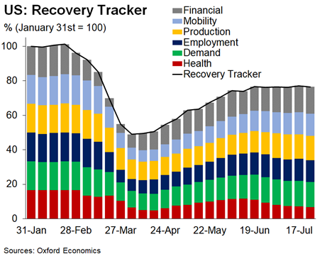 - Our Recovery Tracker fell 0.7ppts to 76.5 in the week ended July 24. Four of the tracker’s six sub-categories declined, with the health index leading the way lower. Risks remain clearly tilted to the downside as more than 60,000 new Covid-19 cases were recorded per day and the economy eagerly awaits another virus relief package.