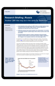 At the September policy meeting, the CBR is likely to consider staying on hold or hiking its policy rate 25bp or 50bp. However, we think a 25bp hike is marginally more likely than the two other outcomes.What you will learn: