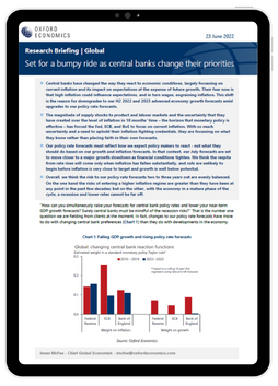 Central banks have changed the way they react to economic conditions, largely focussing on current inflation and its impact on expectations at the expense of future growth. Their fear now is that high inflation could influence expectations, and in turn wages, engraining inflation. This shift is the reason for downgrades to our H2 2022 and 2023 advanced economy growth forecasts amid upgrades to our policy rate forecasts.
