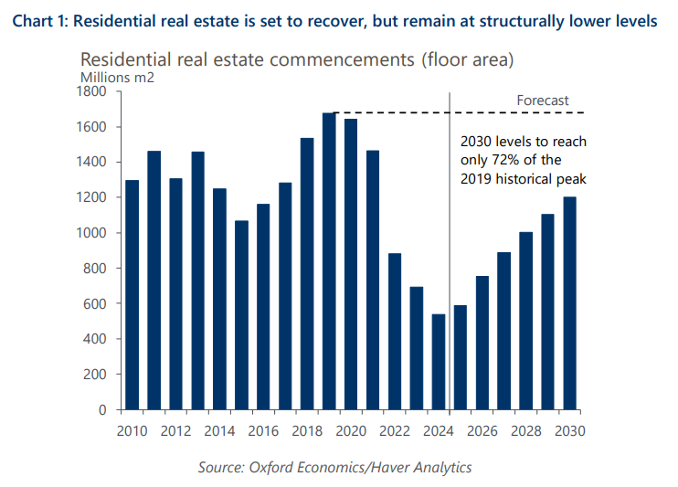 Residential real estate commencements (floor area) are expected to pick up over 2025. However, activity will remain at structurally lower levels, with Chinese authorities expected to maintain their goal to clamp down on speculative demand.