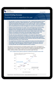 The expectation of a strong recovery in the tourism sector, coupled with the divergence between resilient services activity and a weaker industrial sector, means we expect Southern European economies will generally outperform the rest of the continent this year. Contrary to conventional wisdom, the outperformance of peripheral economies does not reflect a catch-up from the Covid crisis, with Spain being the only country still lagging in its recovery from the pandemic shock.