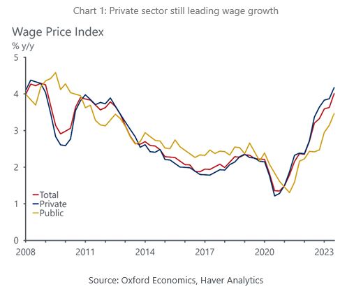 Wage growth had settled at 0.8% q/q in each of the past three quarters. But unseasonably large Q3 increases, and an increase in the share of jobs with a wage change, saw growth jump to 1.3% q/q. Growth was led by private sector wage growth (1.4% q/q), while public sector wage growth was also brisk at 0.9% q/q. Q3 was a perfect storm for wage pressures, the labour market remains in a very tight position, and limited capacity is generating faster wage growth. High CPI inflation is also factoring into wage decisions as workers seek to keep up with cost-of-living pressures. Lastly, the Fair Work Commission’s larger-than-usual increase in minimum and award wages on from 1 July had a large impact on wage growth in Q3.