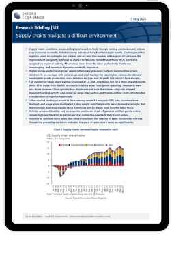 Supply chain conditions remained highly strained in April, though cooling goods demand helped ease pressures modestly. Inflation stress increased for a fourth straight month. Challenges within logistics eased according to our tracker, but we take this reading with a grain of salt since the improvement was partly artificial as China’s lockdowns slowed trade flows at US ports and weighed on business activity. Meanwhile, news from the labor and activity fronts was encouraging, and inventory dynamics modestly improved.