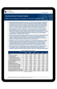 We have lowered Sweden’s growth for this year to 3.1% from 3.6% previously due to the fallout from Russia’s invasion of Ukraine. The main channel will be from higher inflation, weighing on disposable incomes and private consumption. Input shortages, which had been easing until the invasion, are likely to worsen again, although Swedish trade with Russia and Ukraine had been minimal.