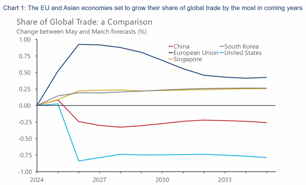 We expect most countries to see a decline in trade with the US and with China as weaker demand weighs on purchases. Even so, some economies including the EU, Vietnam and India are expected to see their share of US imports grow. The US is set to decline sharply as a share of global trade. China’s share of global trade is also set to decline, albeit by a much smaller margin. Europe will be the relative winner, extending its importance within the global trading system.