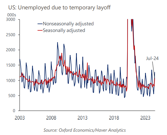- Using microdata from the Bureau of Labor Statistics, we find the increase in temporary layoffs was concentrated in just four industries and that seasonal noise in the labor survey was not removed during the seasonal adjustment process. We expect some of this to be reversed next month, helping to push the unemployment rate back to 4.2% in August.
