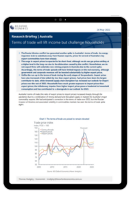 The Russia-Ukraine conflict has generated another spike in Australia’s terms of trade. As energy importers look to substitute away from Russian exports, prices for several of Australia’s key export commodities have risen sharply. The surge in export prices is expected to be short-lived, although we do see gas prices settling at a higher level in the long-run due to the dislocation caused by the conflict.