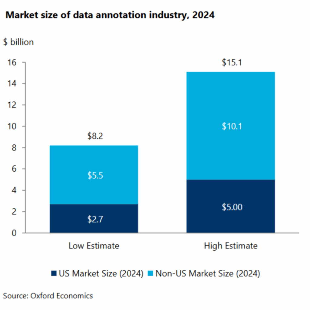 This report provides the first look into the growing market of flexible earning opportunities providing human input and oversight into AI systems and their economic benefits. It details how data annotation supports the AI industry and measures its growing contribution to the US economy. This report estimates the US market for data annotation in 2024 is between $2.7–$5.0 billion, with a projected US market size of $10.3–$19.0 billion by 2030.