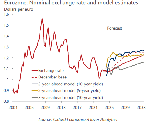 Our new forecast assumes a slower euro appreciation against the dollar over the coming years than we previously anticipated. Relative productivity, terms of trade, and the current account will likely be less supportive of the euro than we thought. In addition, a stronger stock market than initially envisaged will attract more financial flows into the US than we had expected.