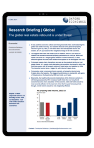 A less positive economic outlook and rising downside risks are threatening the global real estate recovery. Our baseline forecast is for global all property returns to grow by 7.6% pa over 2022-2023. But risk-adjusted returns are weaker, at 7.3% pa, based on the weighted-average of all risk scenarios.