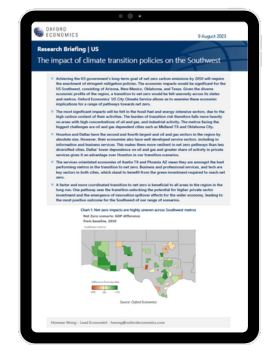 Achieving the US government’s long-term goal of net zero carbon emissions by 2050 will require the enactment of stringent mitigation policies. The economic impacts would be significant for the US Southwest, consisting of Arizona, New Mexico, Oklahoma, and Texas. Given the diverse economic profile of the region, a transition to net zero would be felt unevenly across its states and metros. Oxford Economics’ US City Climate Service allows us to examine these economic implications for a range of pathways towards net zero.