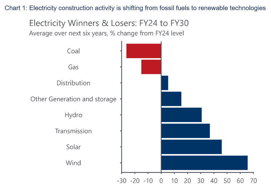 • Construction of wind farms is set to grow rapidly over the next decade as the widespread adoption of solar has begun to saturate the market – we expect wind construction to grow by an average of 12.6% y/y from FY25 to FY30.