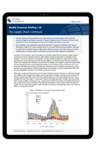The last week has delivered little let-up in the energy price-driven supply shock to the UK economy triggered by Russia’s invasion of Ukraine. Inflation is set to rise above 8% later in the spring and we have downgraded our forecast for GDP growth this year and next.