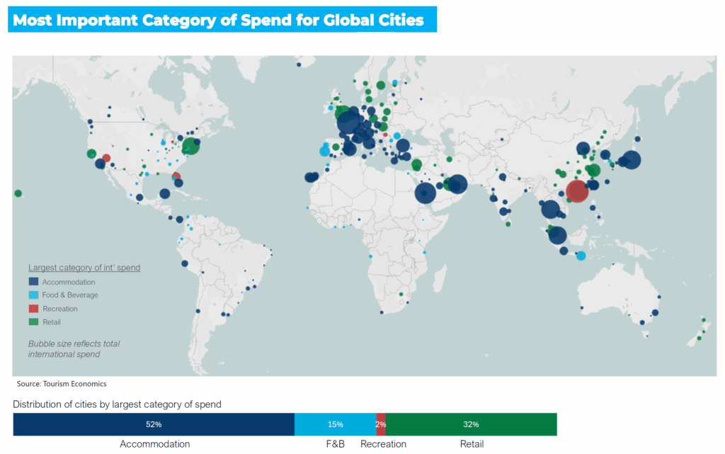 - Middle East & Africa: MEA cities report the largest share of spending on both accommodation and retail of any region. MEA destinations – especially in the GCC – attract higher net worth visitors that tend to indulge in luxury brands.