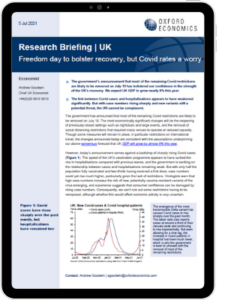 The government’s announcement that most of the remaining Covid restrictions are likely to be removed on July 19 has bolstered our confidence in the strength of the UK’s recovery. We expect UK GDP to grow nearly 8% this year.