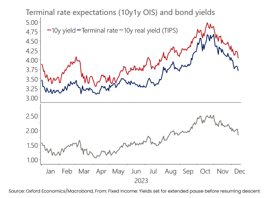 The end of the year brought slightly less hawkish FOMC communications, reinforcing Oxford Economics’ expectations for moderate rate cuts in 2024. After reaching our 4% target for US 10-year yields, our strategists expected a reversal in yields as markets had gone too far in expecting 150bps of cuts.