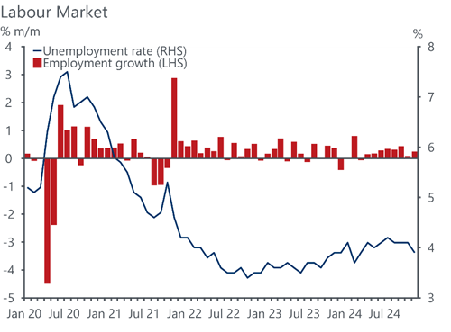 - Given the persistent tightness in the labour market and that underlying inflation remains above the RBA’s target we expect the Bank to keep rates on hold in February. We only anticipate a modest loosening in the labour market in the coming months which means the RBA will need strong evidence that the cooling in inflation is sustainable before cutting rates.