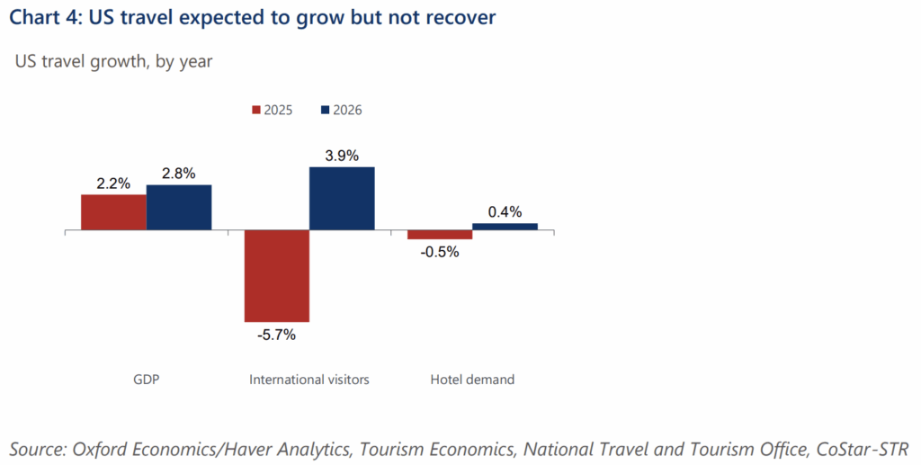 Looking ahead, we forecast 3.9% growth in international inbound travel and 0.4% growth in international inbound and hotel demand this year. The 2026 FIFA World Cup and strong global travel demand—with worldwide arrivals expected to grow 8.0%—should support growth. However, ongoing policy uncertainty and enforcement actions from the Trump administration are likely to limit gains, leaving the US at risk of underperforming other international destination markets again this year.