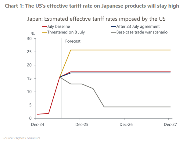 We estimate that the US’s effective tariff rate on Japanese products is around 17%, in line with our baseline assumption. Lower tariffs on autos are a positive, given the sector’s significant contribution to the economy and its broad domestic supporting base.
