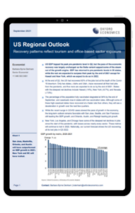 US GDP topped its peak pre-pandemic level in Q2, but the pace of the economic recovery was largely unchanged as the Delta variant sapped some of the steam out of the growth engine. GDP has returned to pre-pandemic levels in 38 states, while the rest are expected to surpass their peak by the end of 2021 except for Hawaii and New York, which we expect to do so in 2022.