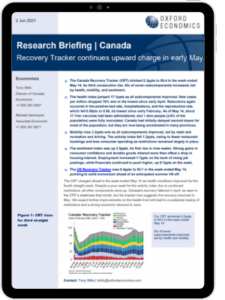The Canada Recovery Tracker (CRT) climbed 2.3ppts to 89.4 in the week ended May 14, its third consecutive rise. Six of seven subcomponents increased, led by health, mobility, and sentiment.