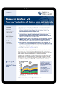 The US Recovery Tracker slipped to 97.5 in the week ended October 1, down 0.6pts from its post-pandemic high in the previous week. Nonetheless, economic momentum remains buoyant, with four out of the Tracker’s six subcomponents above their pre-pandemic levels.