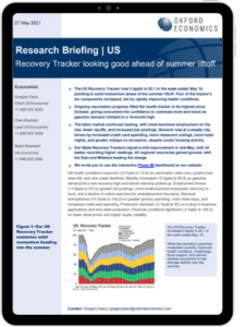 The US Recovery Tracker rose 0.4ppts to 92.1 in the week ended May 14, pointing to solid momentum ahead of the summer liftoff. Four of the tracker’s six components increased, led by rapidly improving health conditions.