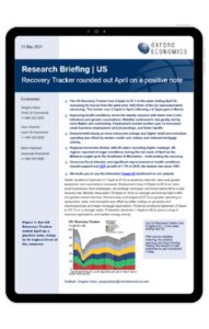 The US Recovery Tracker rose 0.2ppts to 91.1 in the week ending April 30, recouping its losses from the week prior with three of the six subcomponents advancing. The tracker rose 2.7ppts in April, following a 6.7ppts gain in March. Improving health conditions drove the weekly advance with fewer new Covid infections and greater vaccinations. Mobility continued to rise gently, led by more flights and commuting. Employment posted another gain on increased small business employment and job postings, and fewer layoffs.