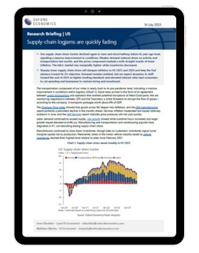 - Sharply lower supply-chain stress will dampen inflation in H2 2023 and 2024 and help the Fed advance toward its 2% objective. Demand remains resilient, but we expect dynamics to shift toward the end of 2023 as tighter lending standards and elevated interest rates lead consumers to cut spending and businesses to restrain hiring and investment.