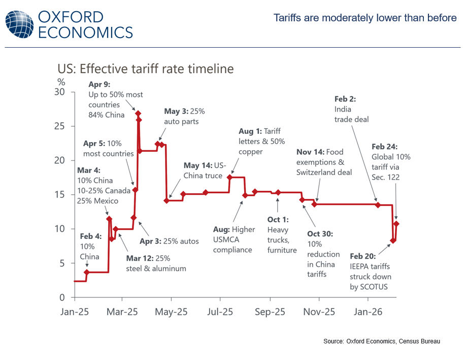 The White House has pivoted to a new tariff authority to impose a 10% global duty, with the possibility of a 15% rate still on the table. While the average effective tariff rate is only modestly lower than before, the shift introduces a new layer of policy uncertainty that could weigh on business decisions and the broader US outlook.