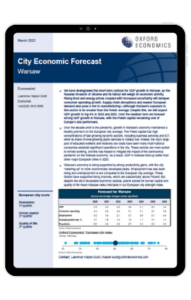We have downgraded the short-term outlook for GDP growth in Warsaw, as the Russian invasion of Ukraine and its fallout will weigh on economic activity. Rising food and energy prices coupled with increased uncertainty will dampen consumer spending growth. Supply chain disruptions and weaker European demand also pose a risk to manufacturing—although Warsaw’s exposure to this sector is far smaller than the Polish average. Despite this, we still expect GDP growth to top 4% in 2022 and 2023. Over the medium term we forecast strong GDP growth in Warsaw, with the Polish capital remaining one of Europe’s star performers.
