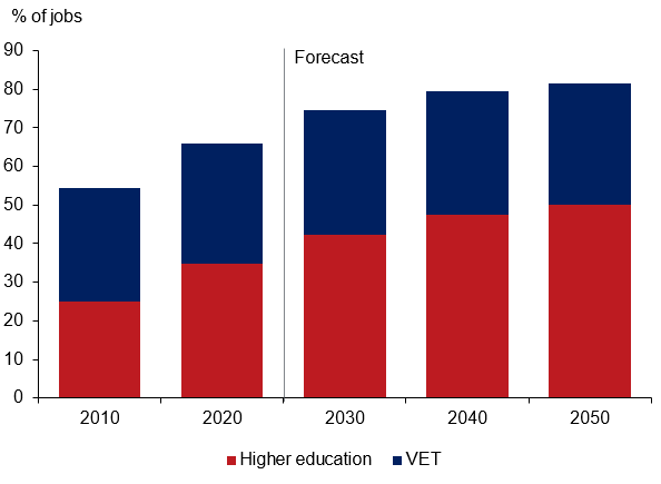 We estimate that around 30% of labour market demand for qualifications will be driven by upskilling and reskilling requirements over the next 30 years as an ageing population and a changing industrial make-up drive life-long learning across the working aged population. Strong cross -sector integration and collaboration between higher education and vocational education will be essential for filling existing and emerging skills gaps in industry, particularly due to the growing nature of skills based hiring practices.
