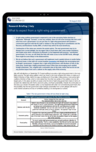 A right-wing coalition government is expected to win in the upcoming Italian elections in September. Although “euroexit” is now very unlikely, there are still some looming risks that could arise from such a government. It is not yet clear if a right-wing government will maintain a constructive approach with the EU, both in relation to the upcoming fiscal consolidation and the Recovery and Resolution Facility (RRF), of which Italy will be the main beneficiary.