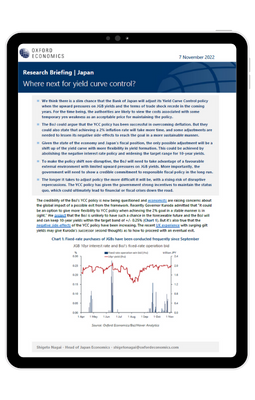 - The longer it takes to adjust policy the more difficult it will be, with a rising risk of disruptive repercussions. The YCC policy has given the government strong incentives to maintain the status quo, which could ultimately lead to financial or fiscal crises down the road.