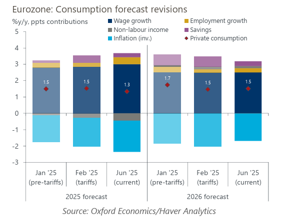 - Consumer spending is less exposed to US tariffs than other GDP components, but not insulated. Tariffs reduce demand for Eurozone’s exporters, which reverberates along the entire supply chain.